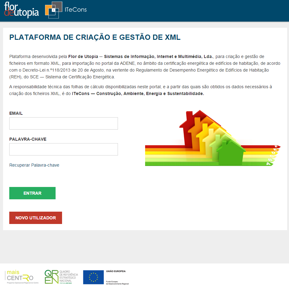 Though this platform, developed by Flor de Utopia, could be created and generated files in XML format, subject of being imported in ADENE portal (in the area of restrict access to qualified experts of SCE), making the automatic filling of the all fields needed to the emission of PCE or CE. The technical responsibility of the calculus sheets available in this portal, and though them are obtained the data needed to the creation of XML files, is from Itecons. The Platform of creation and management of XML files is available in www.itecons.uc.pt/xmlsce/